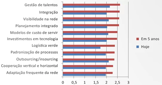 En una encuesta reciente realizada por la Asociación Alemana de Logística a directores de cadena de suministro de sus respectivas empresas, donde se analizaron diversas estrategias de gestión, se concluyó que gestionar a las personas que mueven la cadena es la estrategia más importante entre las alternativas consideradas. La Figura 1 muestra el puntaje promedio asignado por los ejecutivos a cada uno en el escenario actual y en el escenario dentro de cinco años.